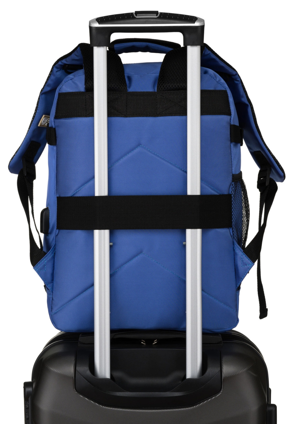 A hátizsák hátsó falán van egy fogantyú, amelyet a bőröndhöz akaszthat.